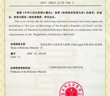 致泻大肠埃希氏菌主要指一类能引起人体以腹泻症状为主的大肠埃希氏菌。生物所针对致泻大肠检验用标准物质匮乏的问题,攻关研制了志贺毒素Ⅱ基因(stx2)、蛋白分泌物调节基因(escV)、热不稳定性肠毒素基因(lt)、集聚黏附菌毛调节基因(aggR)、集聚热稳定性毒素A基因(astA)、肠定植因子基因(pic)等6种常见毒力基因标准物质。该系列标准物质可在-20℃存储条件下稳定24个月,主要配套国家标准GB 4789.6-2016《食品安全国家标准 食品微生物学检验 致泻大肠埃希氏菌检验》使用。