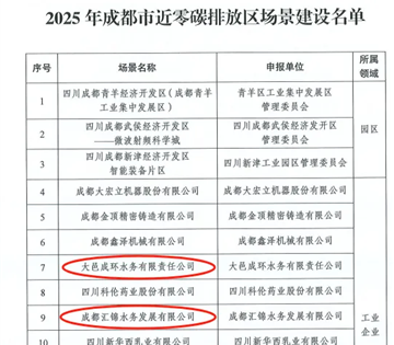 近日,2025年成都市近零碳排放区场景建设名单正式公布,集团下属成都汇锦水务发展有限公司及大邑成环水务有限责任公司凭借低碳创新实践成功入选,为集团零碳示范矩阵再添两张“硬核名片”。