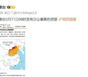 根据中央气象台3月11日06时发布的沙尘暴黄色预警:预计,3月11日08时至12日08时,新疆南部、内蒙古中西部、甘肃东部、宁夏、陕西中北部、山西、河北、北京、天津、河南北部、山东北部、辽宁西部、吉林西部等地有扬沙或浮尘天气,其中内蒙古中西部的部分地区有沙尘暴,局地有强沙尘暴。