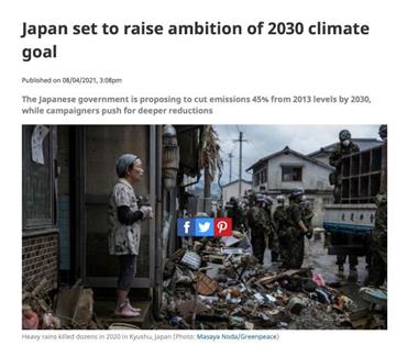 2021-04-20 【动向】日本拟调高气候目标:到2030年绝对减排45% 据日本共同社报道,日本政府准备在近期宣布强化2030年减排目标。此前的目标是在2013年的基础上削减26%,而新的目标减排幅度将达40-45%。