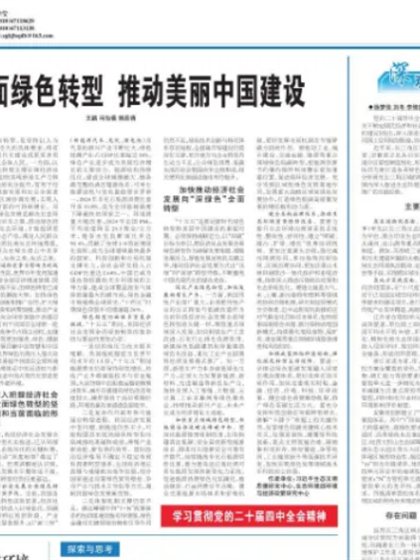 党的二十届四中全会对“加快经济社会发展全面绿色转型,建设美丽中国”作出系统部署,为“十五五”时期推动绿色发展,促进人与自然和谐共生指明了方向。必须深刻领悟党中央作出这一重大安排的战略考量,深入研判当前的工作基础和形势挑战,谋划推进经济社会发展全面绿色转型的战略举措,推动美丽中国建设取得新的重大进展。