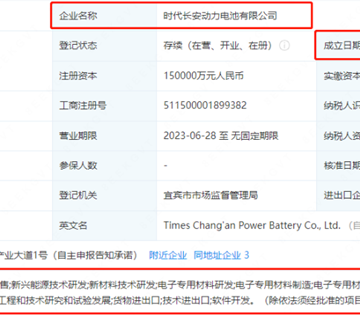 据悉,该公司经营范围包含:电池制造;电池销售;新兴能源技术研发;新材料技术研发等。该公司由宁德时代新能源科技股份有限公司(以下简称:宁德时代)、深蓝汽车科技有限公司、长安汽车共同持股。