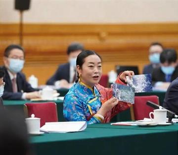 2021年3月,全国两会期间,在青海代表团审议现场,来自海北藏族自治州的孔庆菊代表拿出照片,请坐在对面的习近平总书记观看。